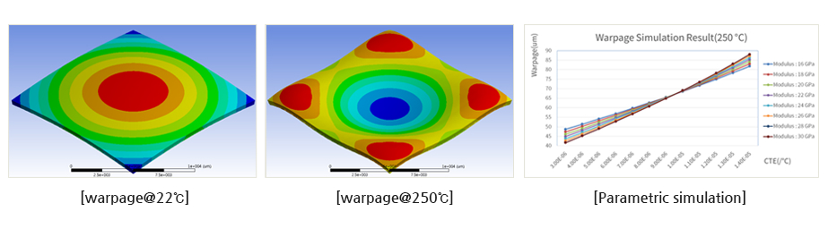 Flip Chip, POP, and MCP are widely adopted in the current semiconductor packaging process to connect chips to PCB directly using solder balls instead of WLCSP and wire. To respond to such changes in the packaging technology, Doosan CCL products have low CTE and high Tg product lines. In addition, thickness of epoxy molding compound (EMC) is reduced due to ultra-thin PKG, and density of Cu pattern has a great effect on warpage in PCB. We support the warpage simulation service using the ANSYS workbench and 3D Moire measurement that can measure PKG warpage by temperature profile.Warpage simulation service of super-thin plate PKG, PCB, and CCL
